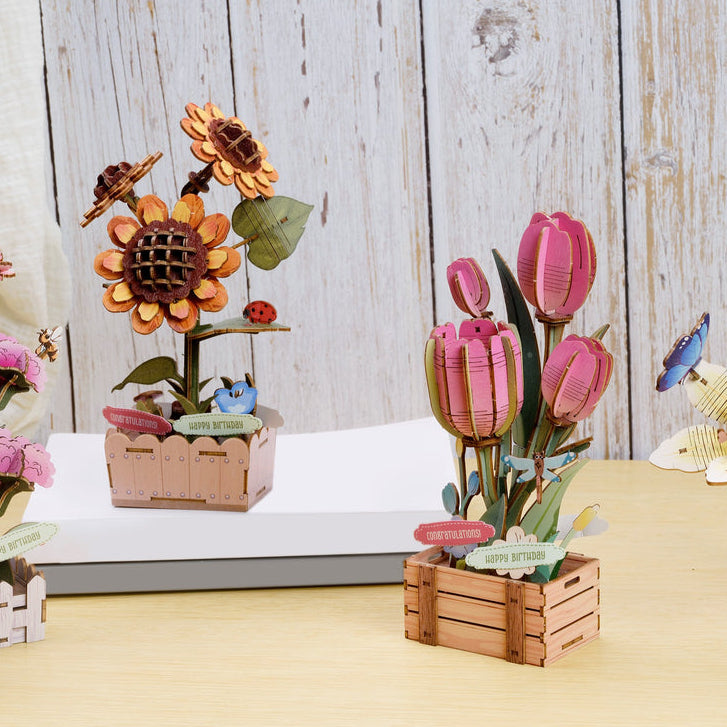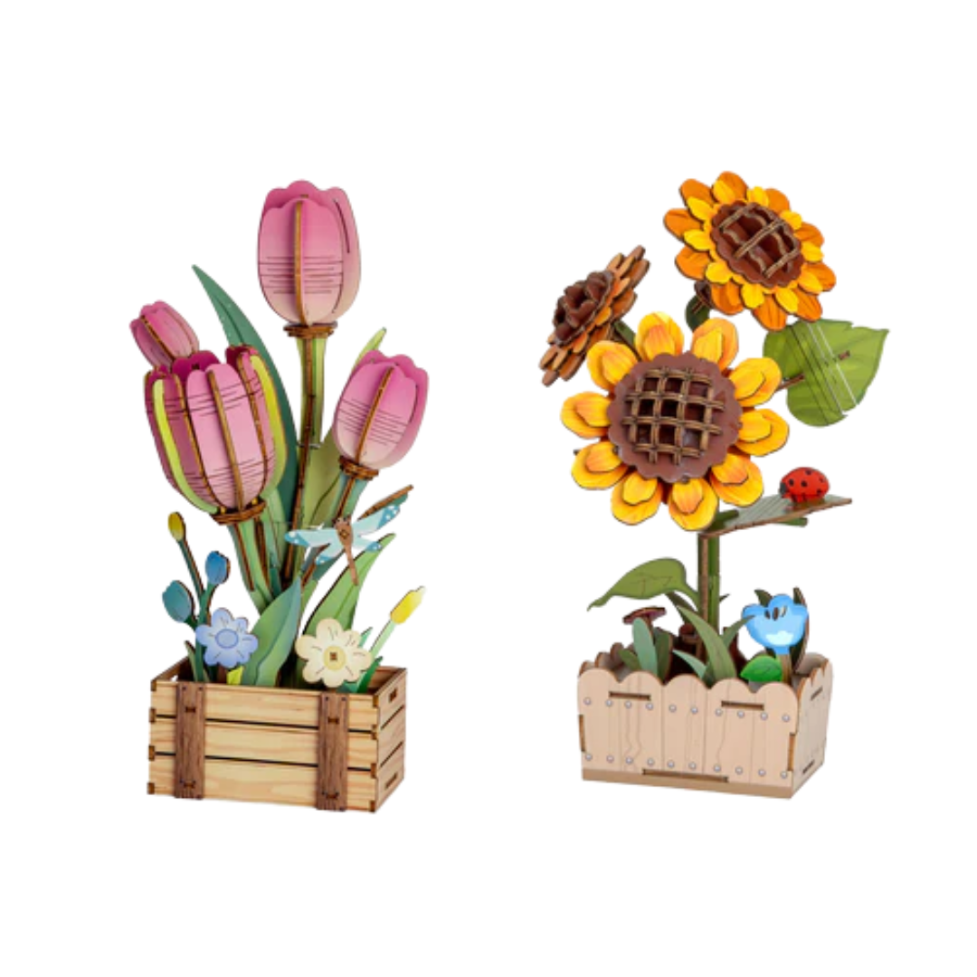 DIY 3D Wooden Puzzle Kit – Sunflower and Pink Tulip Sets