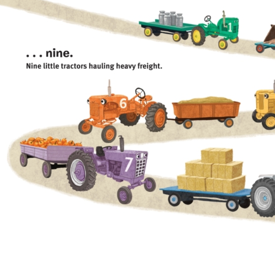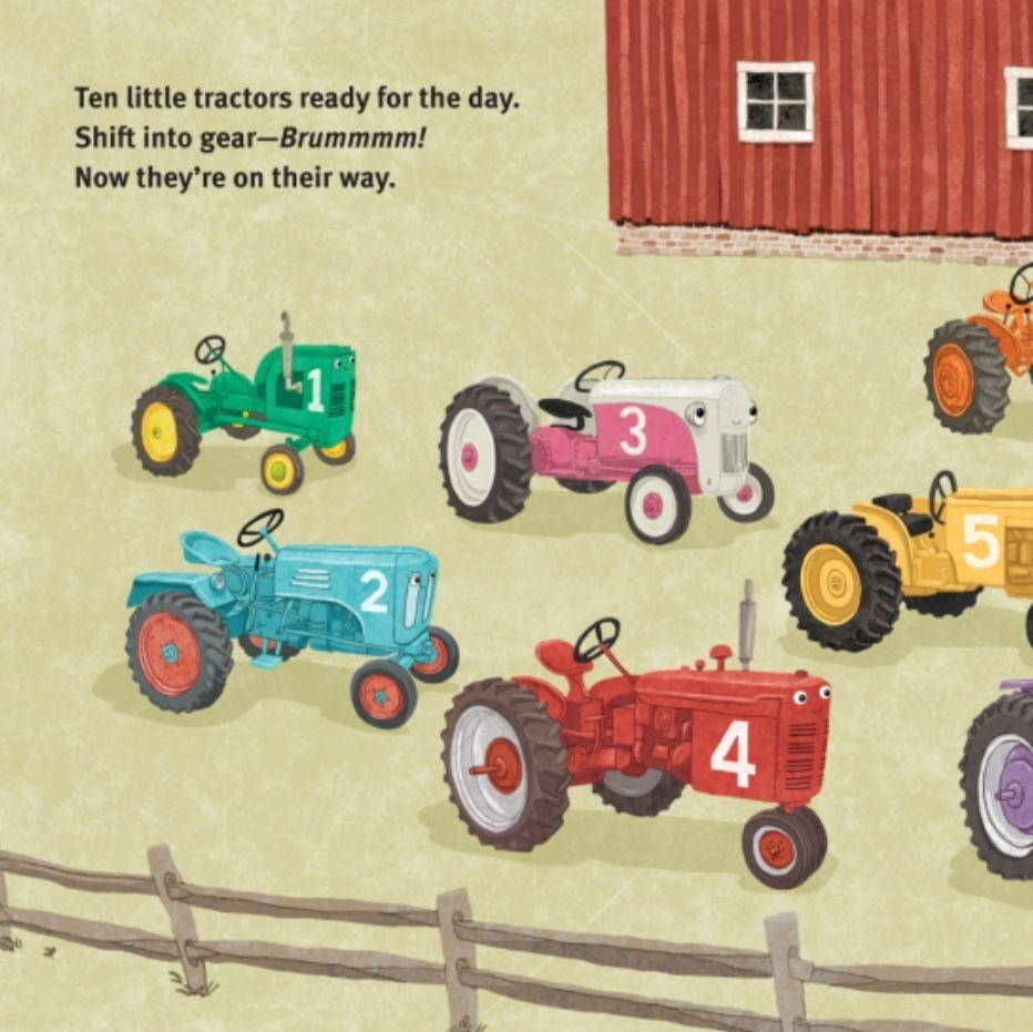Learn to count with 10 busy little tractors working hard on the farm! This engaging board book introduces young readers to numbers and farm life, featuring noisy words and lively scenes on every page.