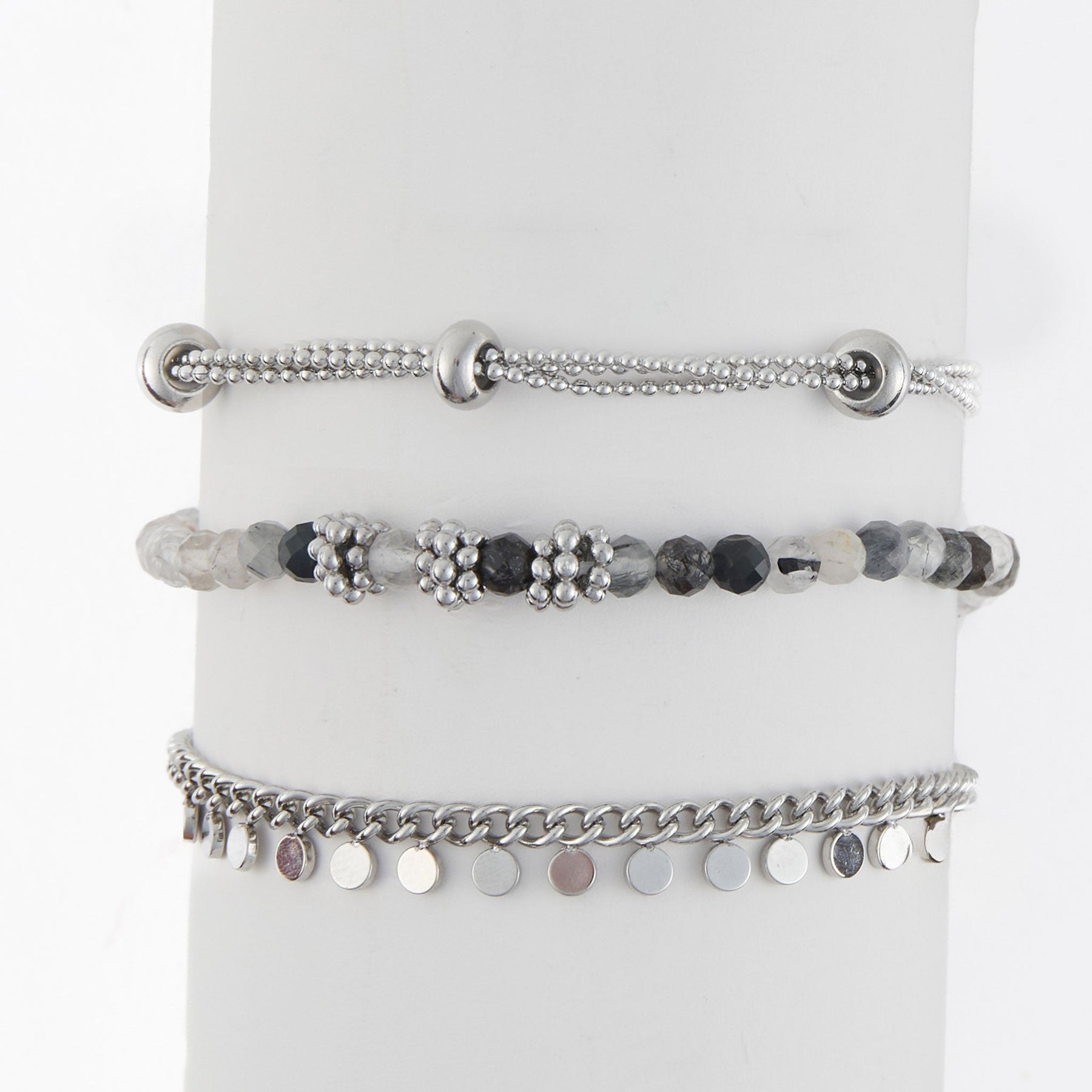 Includes a sleek chain with dangling discs, beaded stretch bracelet, and double-strand bracelet