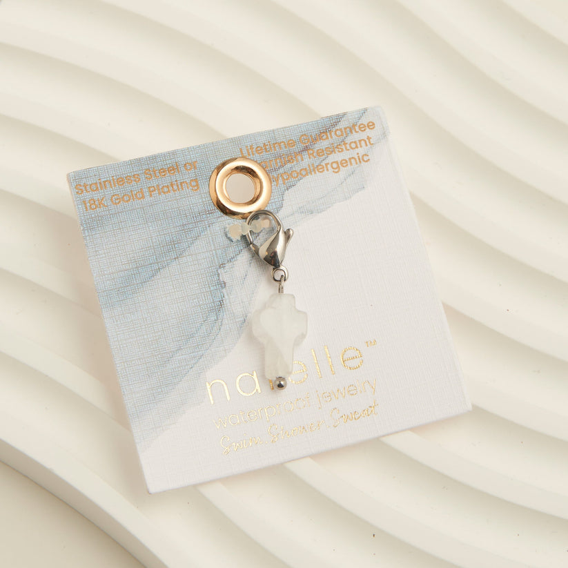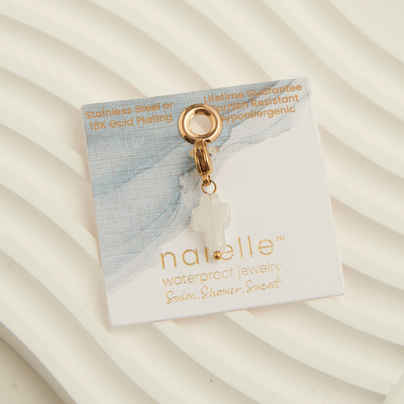 Adorable and durable, the Narelle Waterproof Cross Charm features an 18k gold plated or stainless steel plated clasp and a sparkling white stone cross. Easily attach it to your favorite Narelle Waterproof bracelet to create a look as unique as you! Hypoallergenic, tarnish-resistant, and backed by a lifetime color guarantee.