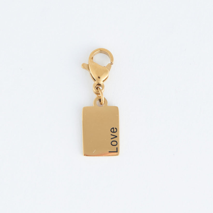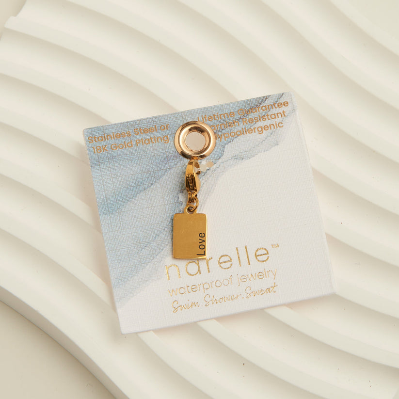 Adorable and durable, the Narelle Waterproof Love Tag Charm features an 18k gold plated dainty tag etched with the word "Love." Attach it to your favorite Narelle Waterproof bracelet or necklace to create a look as unique as you! Hypoallergenic, tarnish-resistant, with a lifetime color guarantee.