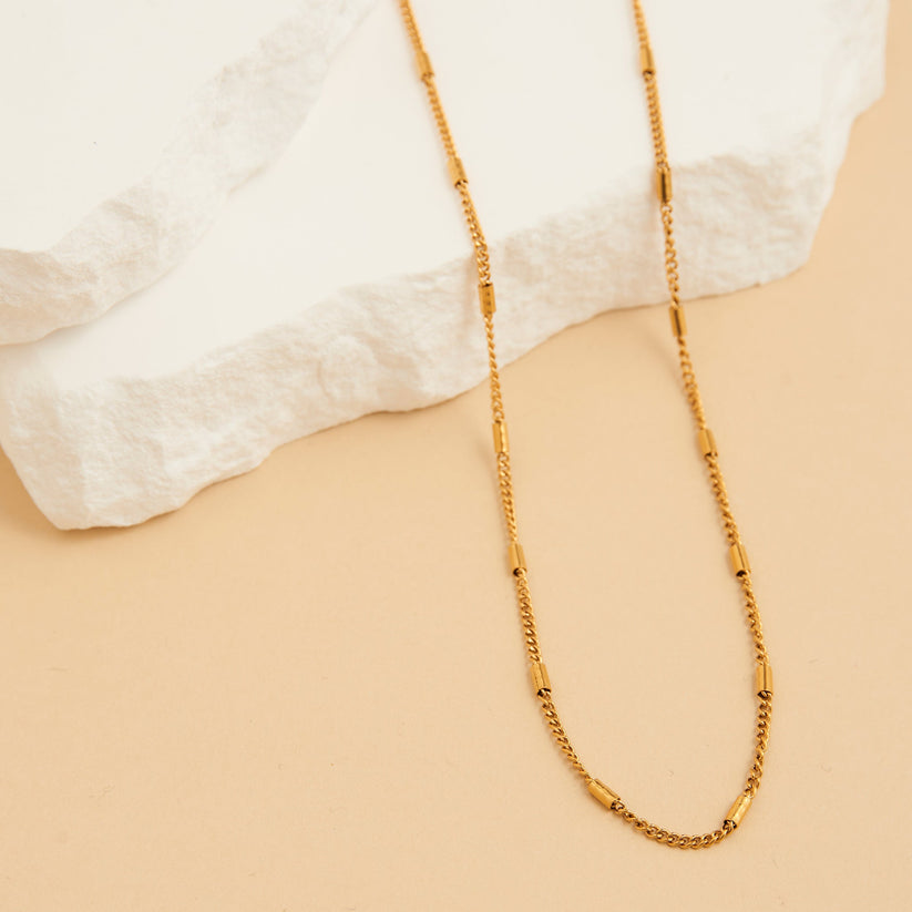 Elevate your everyday style with the Narelle Waterproof Bar Satellite Chain Necklace, featuring sleek bar link accents on a delicate cable chain. Available in 18K gold-plated and stainless steel silver finishes, this 20" necklace with a 3" extender is waterproof, tarnish-resistant, hypoallergenic, and safe for sensitive skin—perfect for daily wear. Its secure lobster clasp ensures comfort and durability, making it an ideal, versatile piece to layer or wear alone.