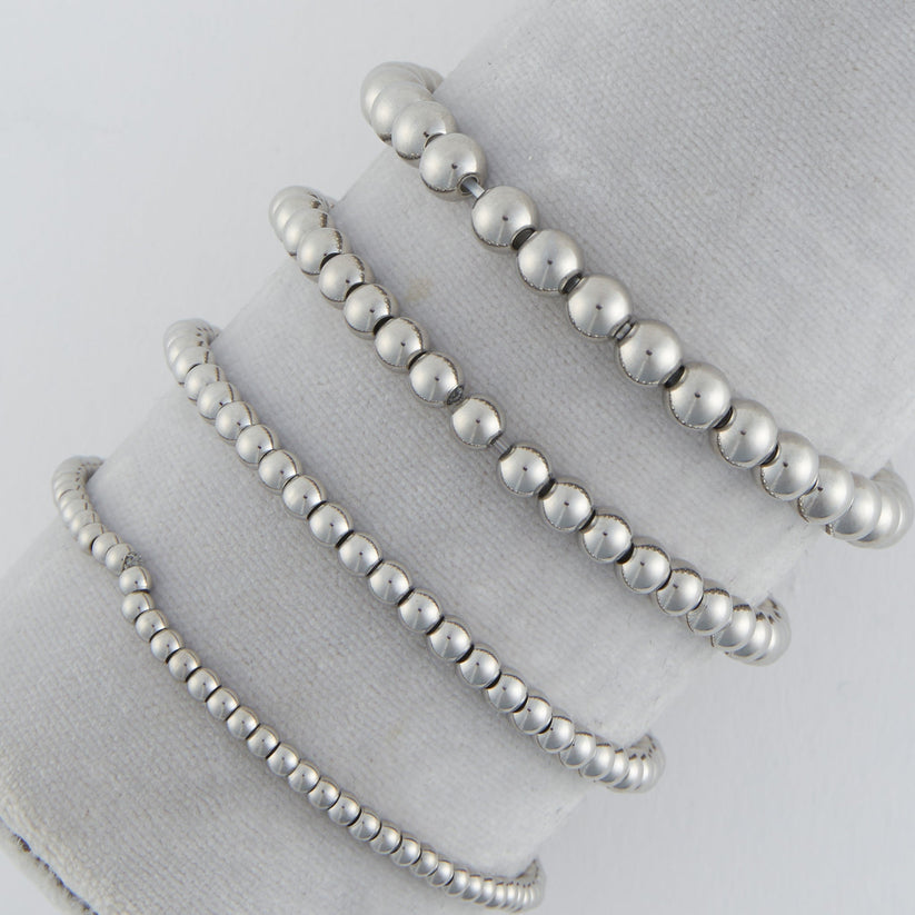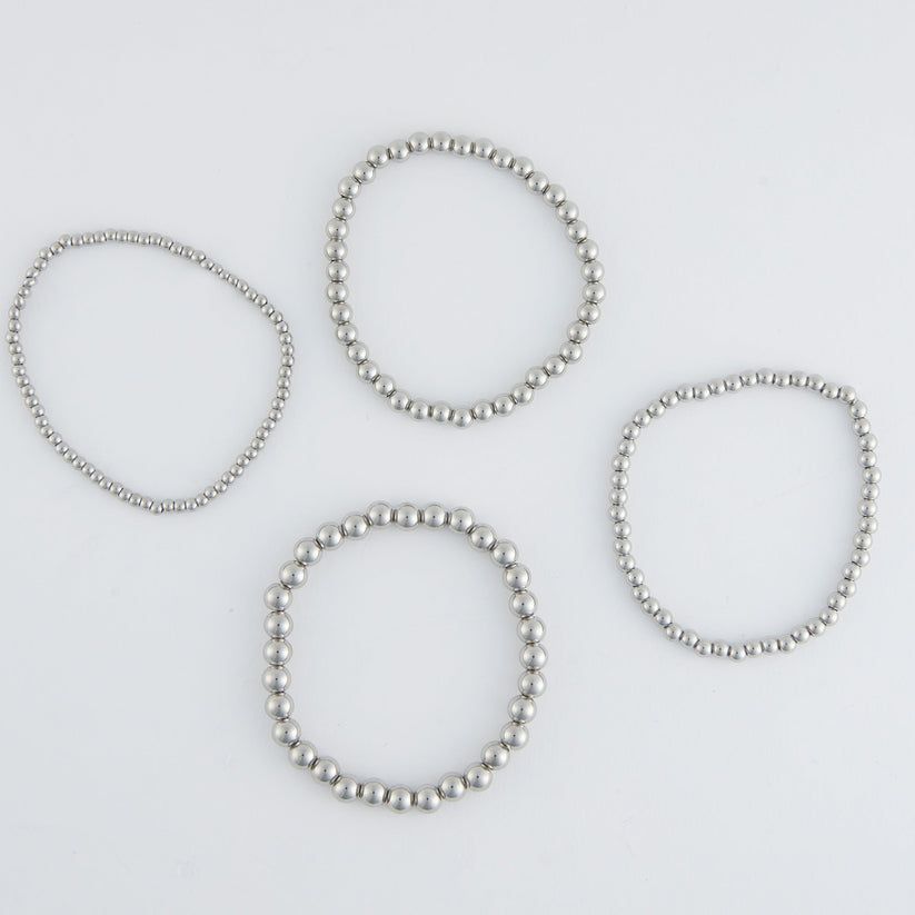 Achieve the perfect layered look with this set of four stretch bracelets, each featuring stainless steel plated ball chains in varying sizes. Designed for everyday wear, these bracelets are durable, comfortable, and effortlessly stylish.
