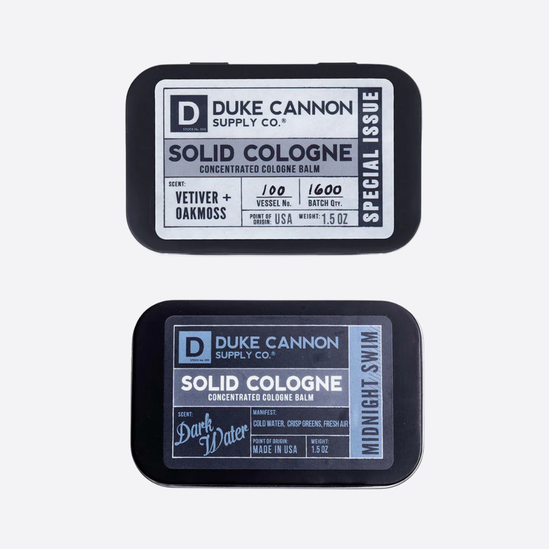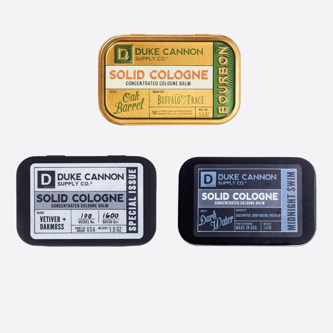 Stay sharp and smell great anywhere with Duke Cannon Solid Cologne Traveling Tins. Designed for hard-working men on the go, these concentrated cologne balms provide precise, mess-free application. Made with natural and organic ingredients, each 1.5 oz tin delivers long-lasting fragrance that fits perfectly in briefcases, gym bags, or desk drawers. A portion of proceeds benefits U.S. veterans.