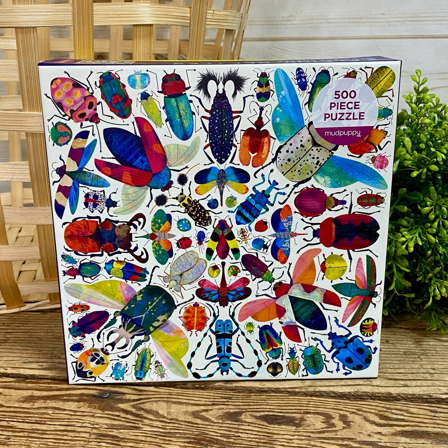 • 500-piece jigsaw puzzle with a kaleidoscope-inspired beetle illustration