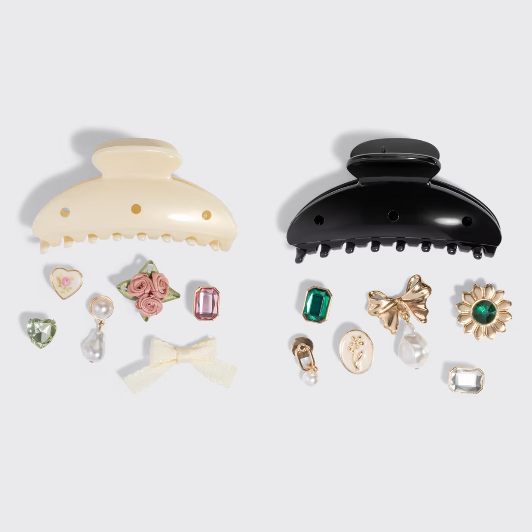 Each set includes six collectible, interchangeable charms, giving you endless ways to refresh your look. The curved claw design comfortably grips hair without snagging, making it ideal for all-day wear. Compatible with other KitschPop™ charm sets, this eco-friendly hair accessory lets you express your style sustainably.