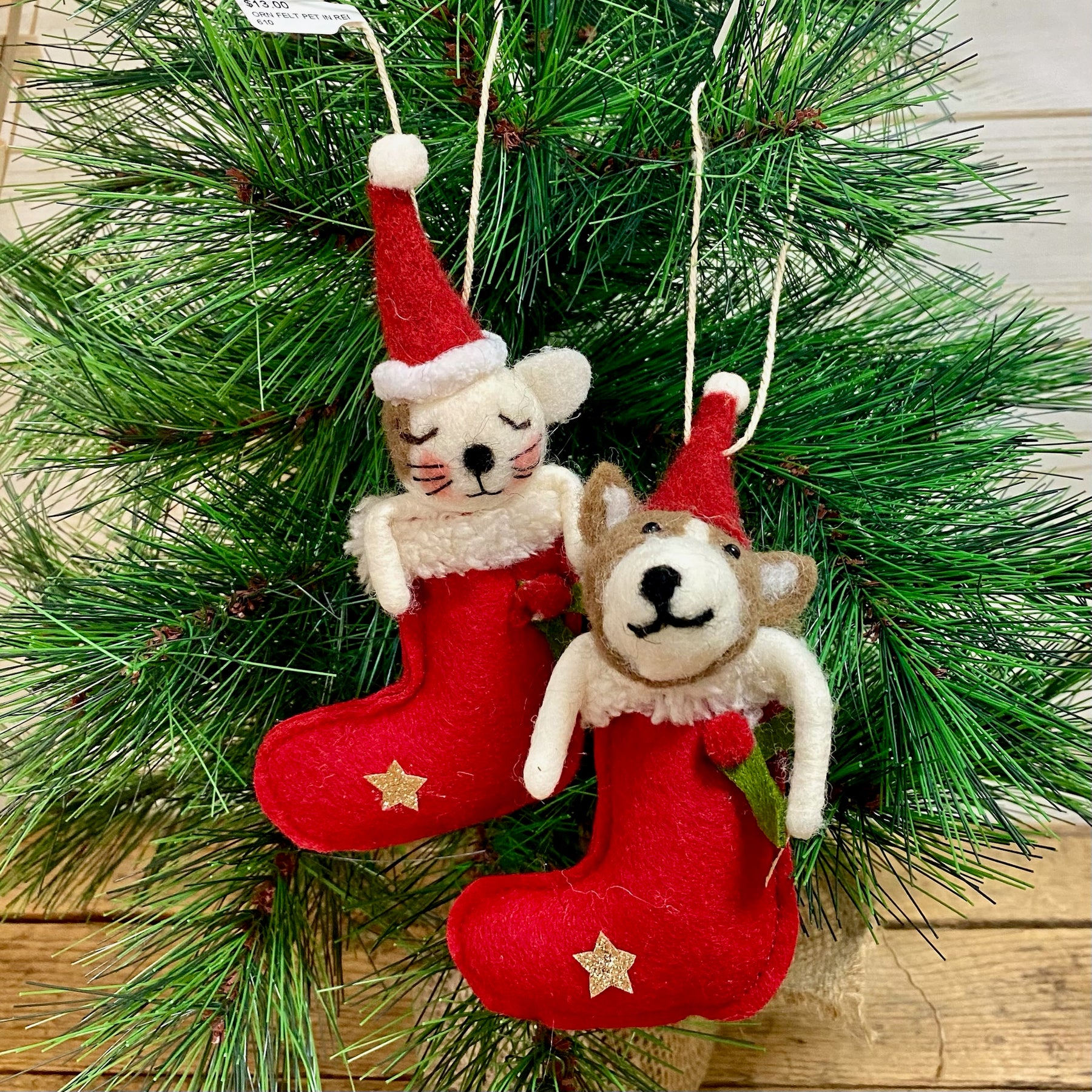 Celebrate your furry friends this holiday season with Pet in Stocking Ornaments. These charming felt ornaments feature a dog or cat wearing a Santa hat, peeking out of a cozy stocking for a playful, festive touch on your Christmas tree.