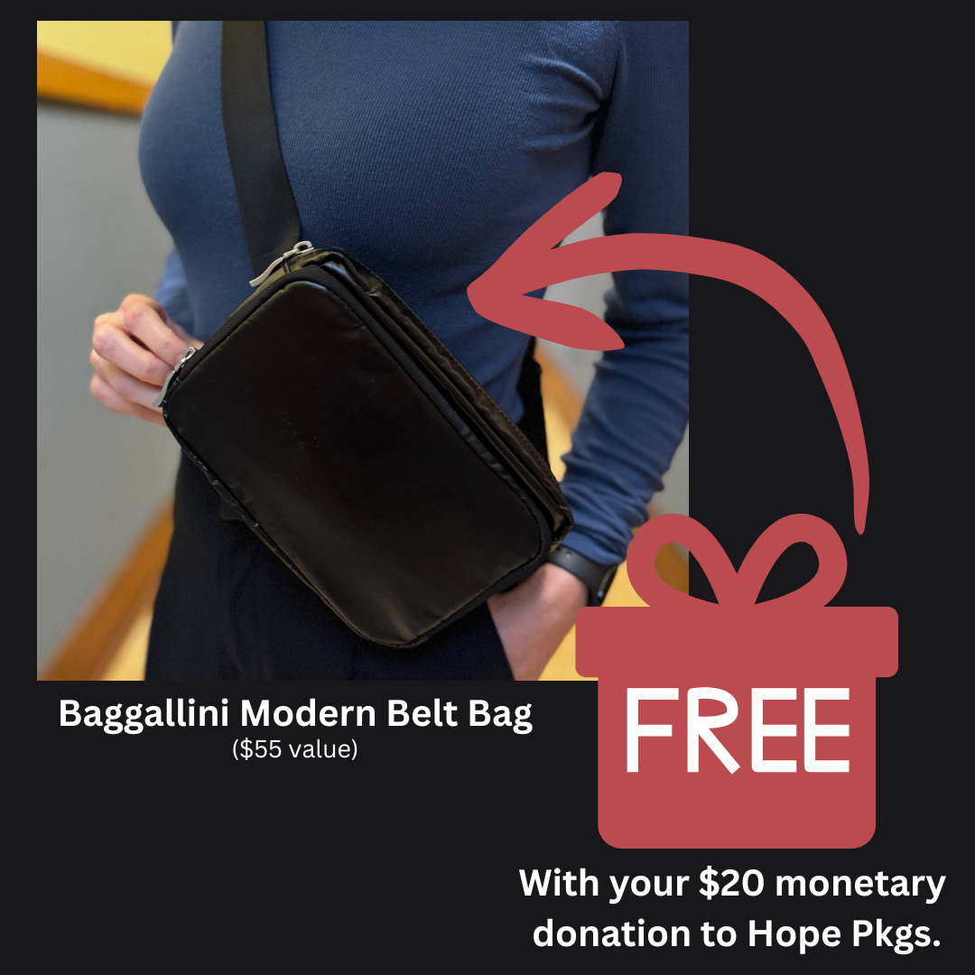 As a thank you for your generosity, we are giving away a free Baggallini Modern Belt Bag with every $20 donation. (While supplies last.) Sorry, we are unable to ship this free gift. If you would like to pick up your free gift in-store please leave us a message in the order notes and we will have one waiting for you here at the store. Please indicate if you'd prefer black or blue.