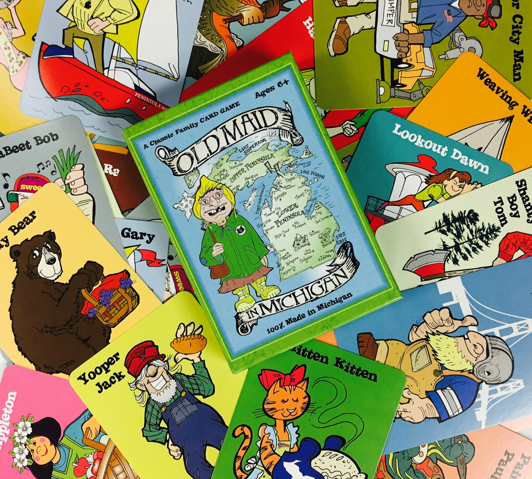 Old Maid in Michigan is a playful, educational spin on the timeless family card game—packed with state pride and Michigan charm. Designed and printed 100% in Michigan, this oversized card deck features colorful illustrations of iconic Michigan characters, mascots, and symbols that define the Great Lakes State.