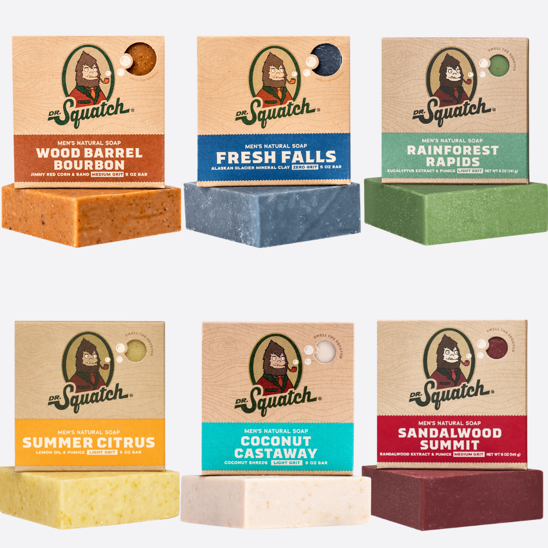 Coconut Castaway: Pour yourself a piña colada, kick back and lather up for a Squatch-cation with Coconut Castaway. Featuring antioxidant-rich Coconut Water, skin-rejuvenating Coconut Milk and gently exfoliating Coconut Shreds, this bar is your first class ticket to a shower getaway. The tranquil and exotic scent of toasted coconut will transport you to a beach chair in the sun and revive your senses for the day ahead. Light Grit. Coconut Shreds & Sea Salt.