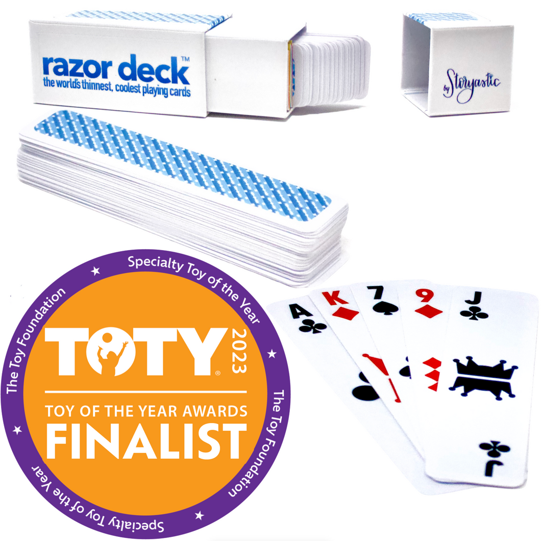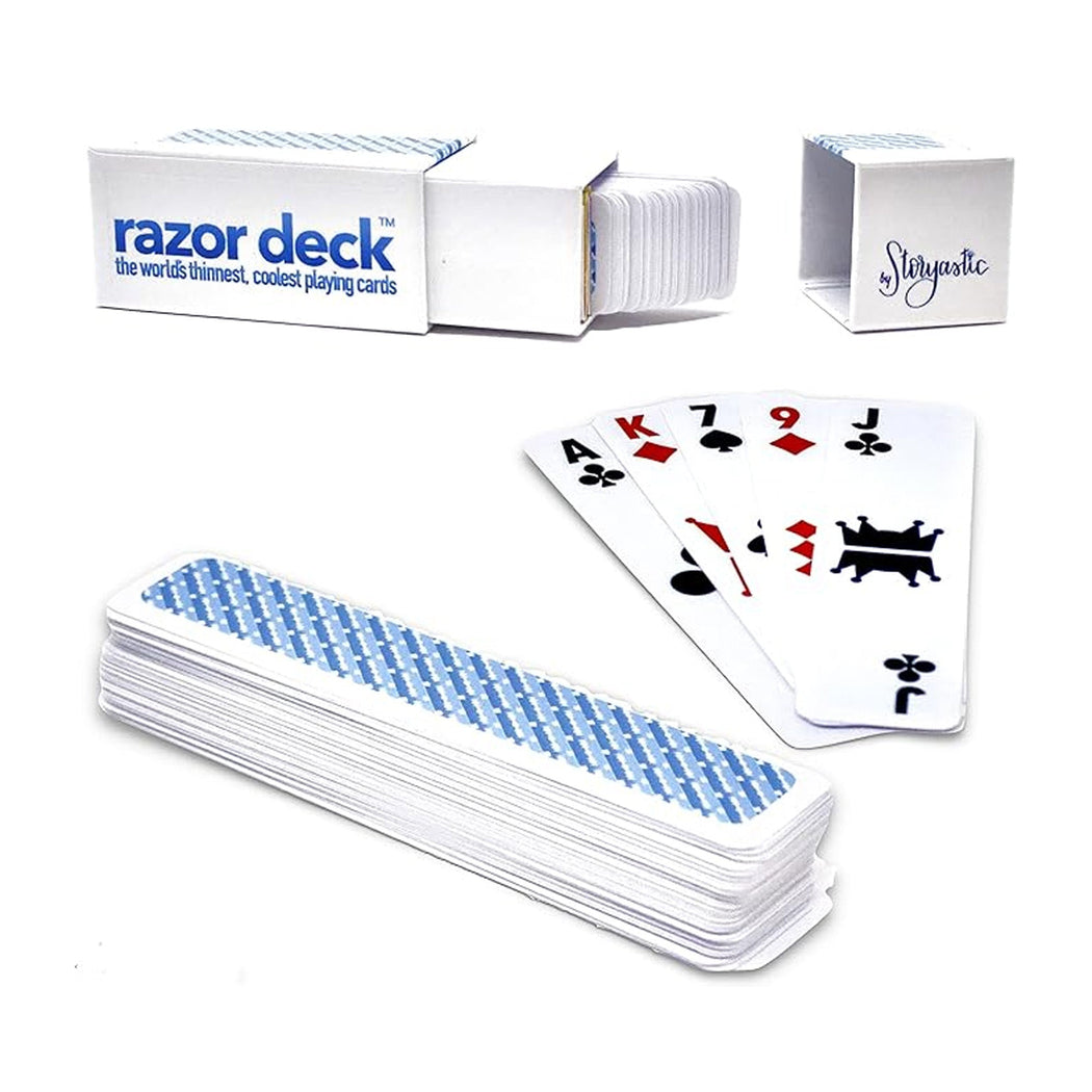Razor Deck Playing Cards are high-profile playing cards with a low profile. Every card game you play only uses the edges of the cards, so why have that wasted space? With Razor Deck, you can hold a 5-card hand in the width of one standard card. You can fit the entire deck laid out for solitaire on an airplane seatback table and still have room for your drink and snack.