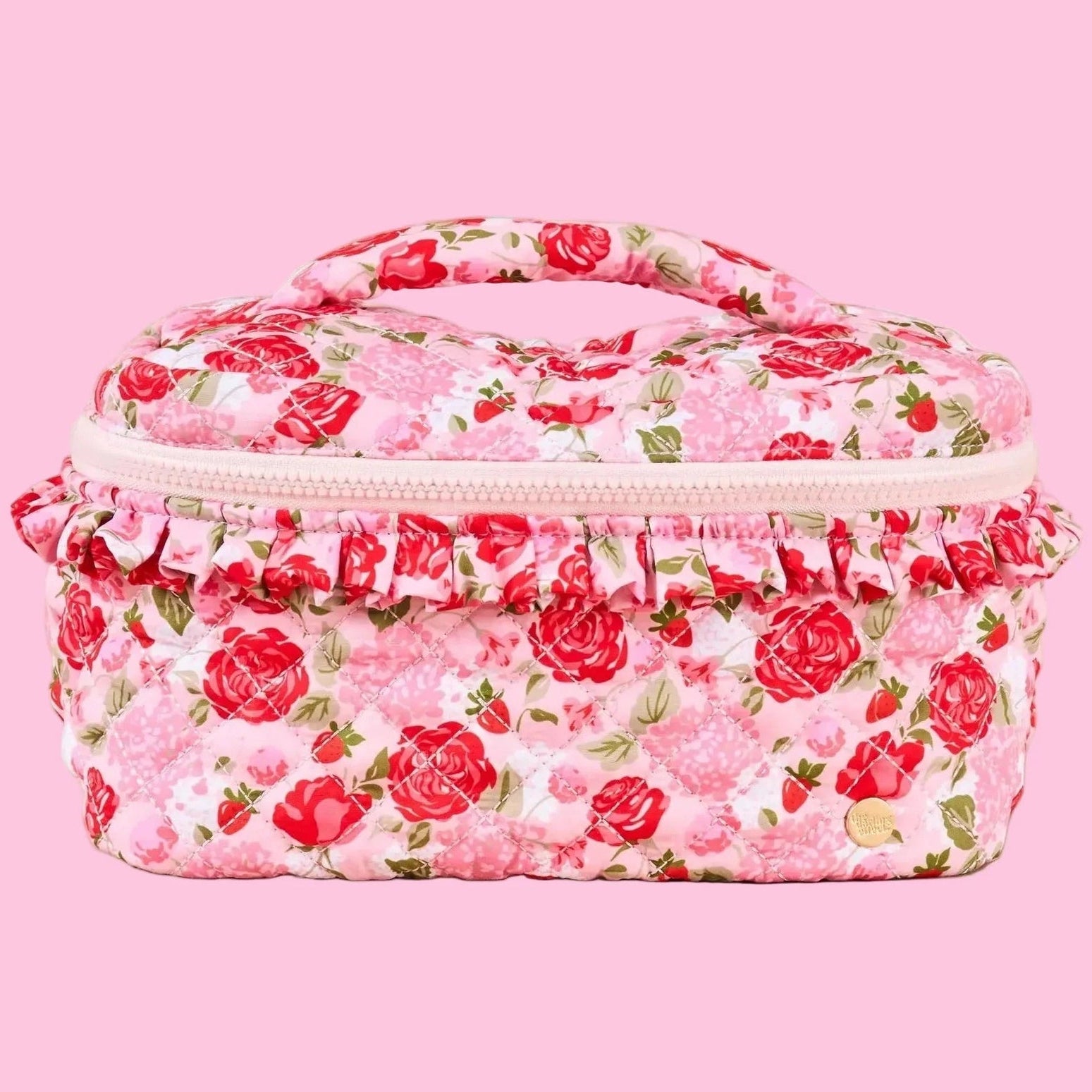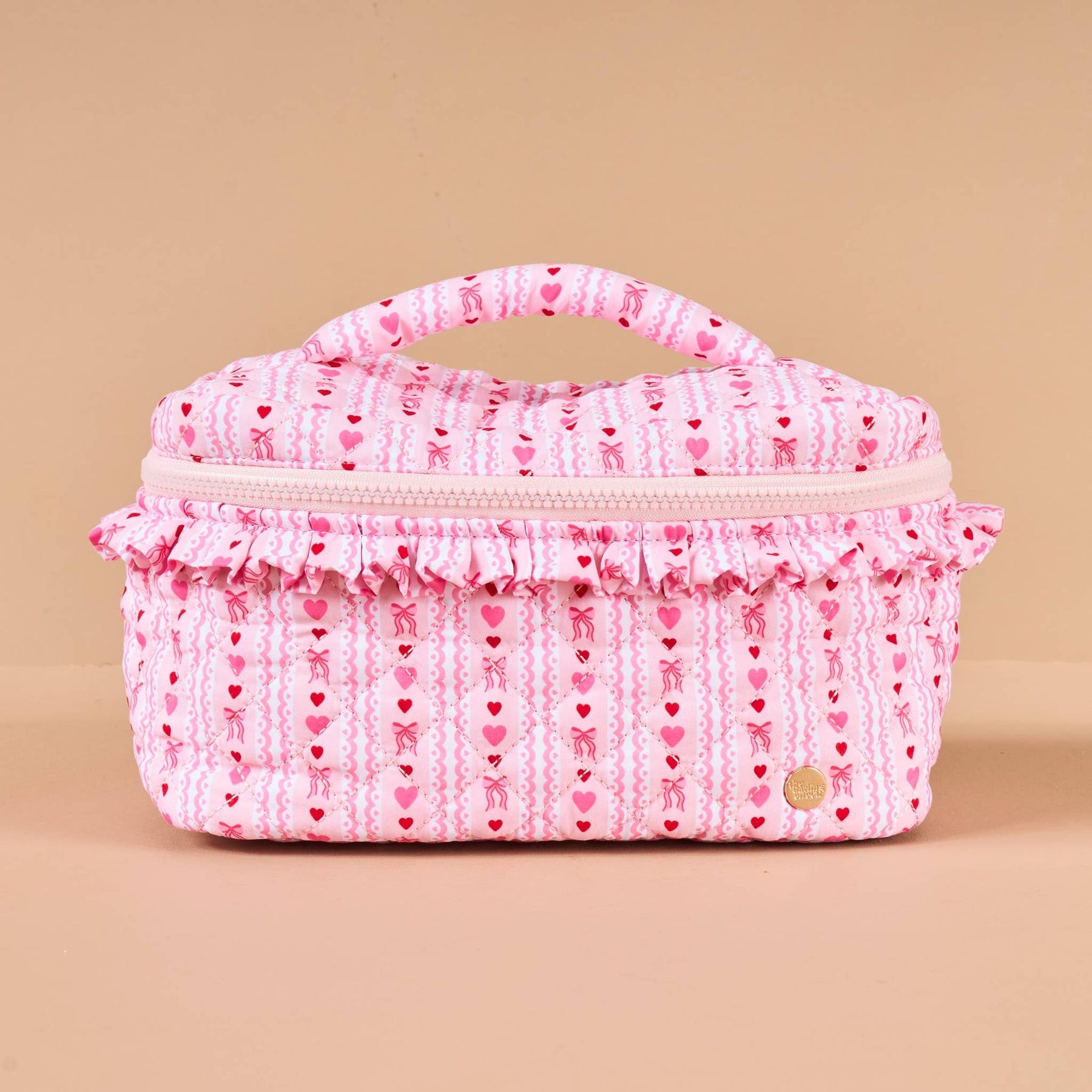 Stay organized in style with the Glam & Go Quilted Cosmetic Bag. Designed for beauty on the move, this cosmetic bag is crafted from soft, quilted fabric and features a durable top handle for grab-and-go convenience. The gold-tone double zipper provides full access to your essentials, while the wipeable interior lining and interior pocket make organizing makeup, skincare, and toiletries easy and mess-free.