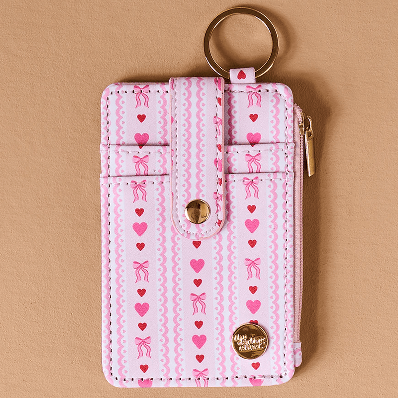 Simplify your carry with the Printed Keychain Wallet, designed for style and convenience. Made from high-quality vegan leather, this lightweight wallet features charming prints and patterns to match your personal flair. The compact design includes four card slots, a zippered coin pocket, and a gold keyring—perfect for attaching to your keys or wearing as a wristlet on the go.