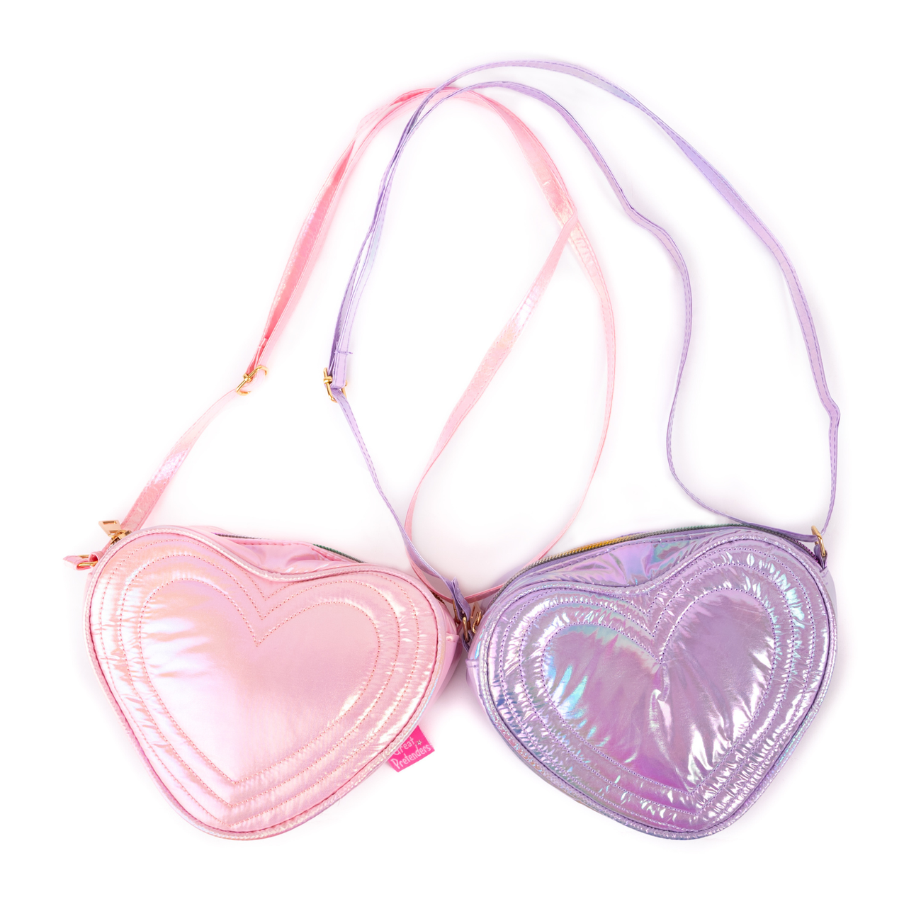 Includes two heart-shaped plush crossbody bags: one soft purple, one bright pink