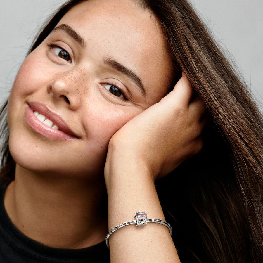 Add a sweet and whimsical touch to your holiday jewelry with the Festive Gingerbread House Charm from Pandora. Crafted in sterling silver and decorated with rich caramel brown, red, and green enamel, this charming house features detailed candies and lollipops, a heart-shaped door handle, a swirled icing roof with a chimney, and sparkling pavé accents. A Christmas tree on one wall completes the festive design, making it a perfect reminder of cozy holiday traditions and joyful memories.