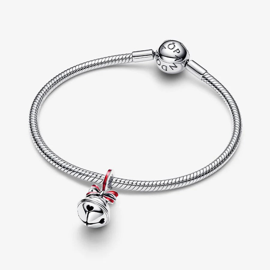 Bring festive cheer to your bracelet with this sterling silver Holiday Bell Dangle Pandora charm. Featuring glossy red enamel and a ribbon-topped bail, it adds a playful and sparkling touch to any holiday collection.
