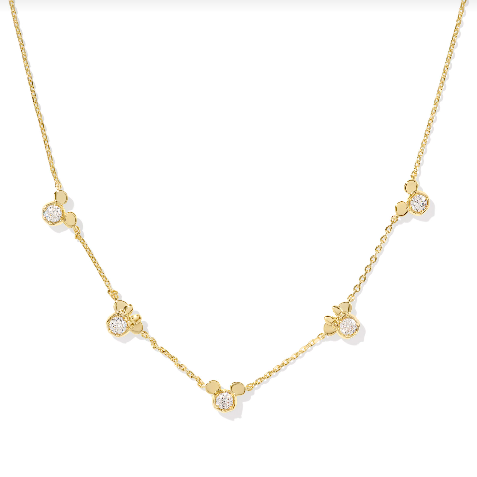 Celebrate classic charm and modern style with the Disney | Kendra Scott Minnie Mouse Short Pendant Necklace. Featuring the signature Kendra Scott Davie stone shape, this necklace is adorned with playful Minnie Mouse ear motifs and a delicate bow detail, making it a sweet and chic accessory for any Disney fan.