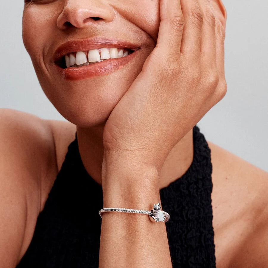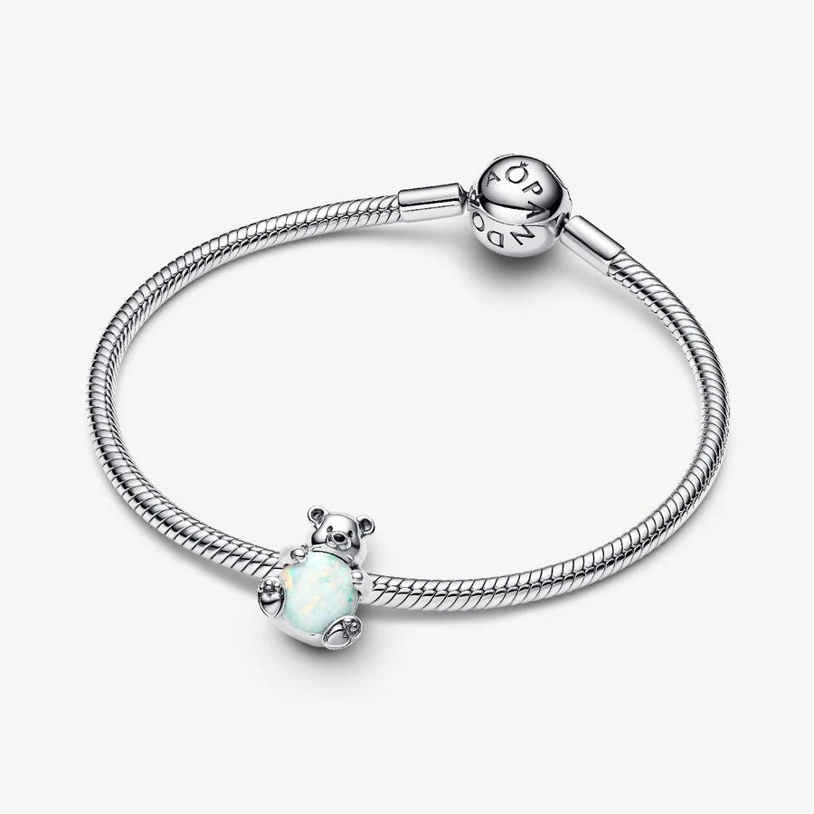 Celebrate the warmth of the holiday season with the Polar Bear Charm from Pandora. This sterling silver charm features an adorable polar bear with enamel eyes hugging a radiant lab-created opal that resembles a snowball. The back of the bear is engraved with the heartfelt message “Warm Hugs,” making it a charming and meaningful addition to your Pandora Moments bracelet.