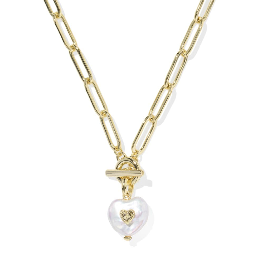 Elevate your jewelry collection with the Sasha Heart Link and Chain Necklace by Kendra Scott—a modern twist on classic pearls. This trend-forward necklace features a heart-shaped freshwater cultured pearl adorned with a unique metallic beauty mark. Suspended on a stylish toggle-closure paperclip chain, it’s a chic, eye-catching piece perfect for layering or wearing solo.