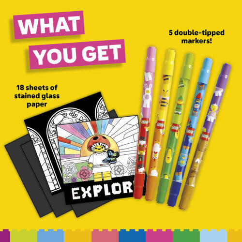 Transform ordinary windows into colorful LEGO stained glass masterpieces with the Klutz LEGO Stained Glass Art Kit! This travel-friendly kit includes 5 double-tipped markers (10 colors total) and a book full of creative designs featuring favorite LEGO minifigures. Simply color your designs, hang them in a sunny window, and watch the vibrant colors shine. Perfect for creative fun at home or on the go!