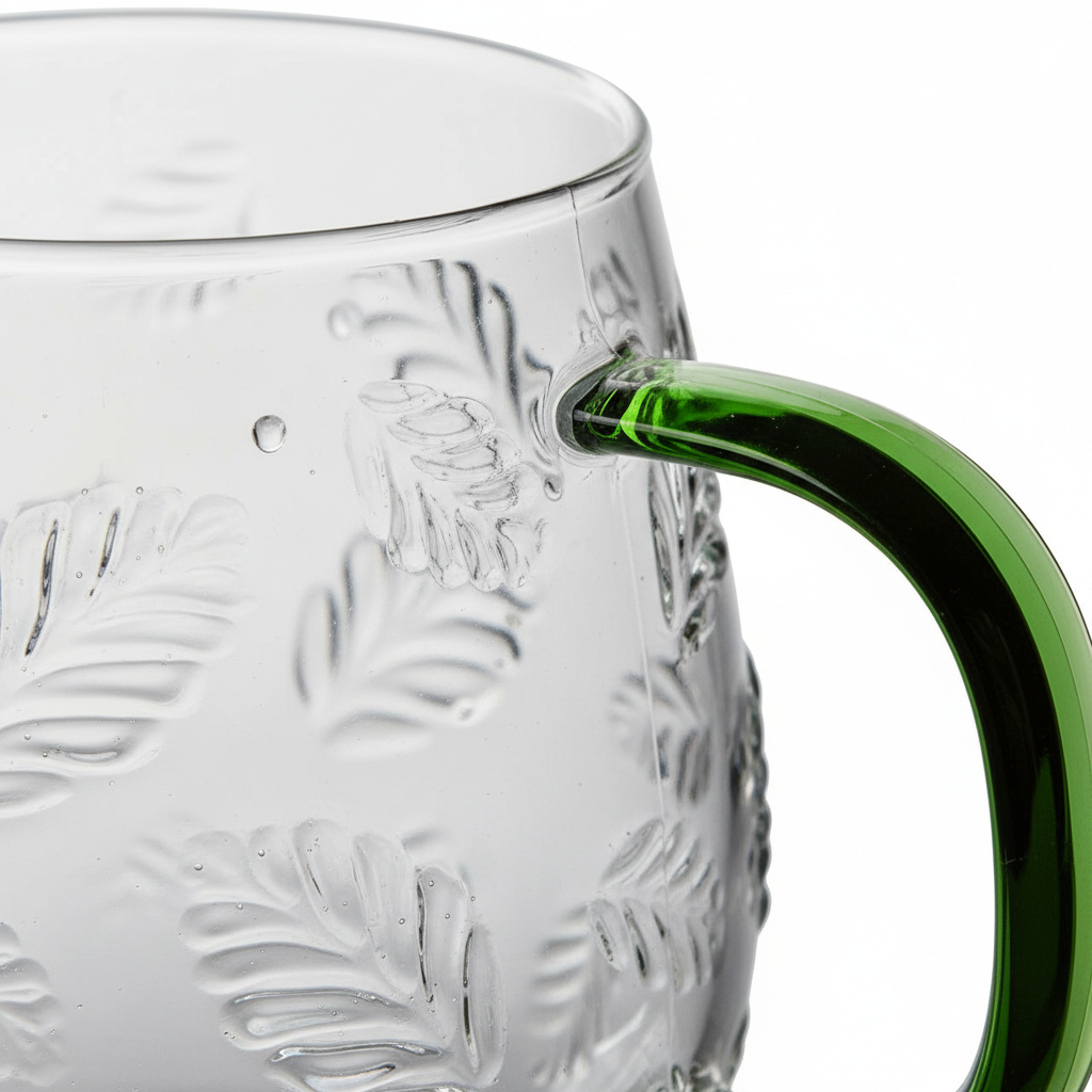 Sip in style with the elegant Botanical Glass Mug, crafted from durable borosilicate glass. Featuring delicate etched greenery and a vibrant green handle, this mug is perfect for enjoying both hot and iced beverages with a touch of natural beauty.