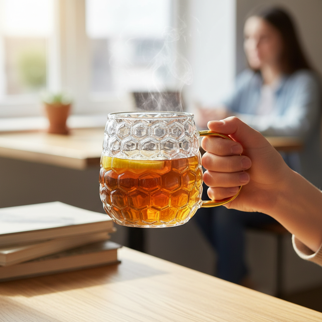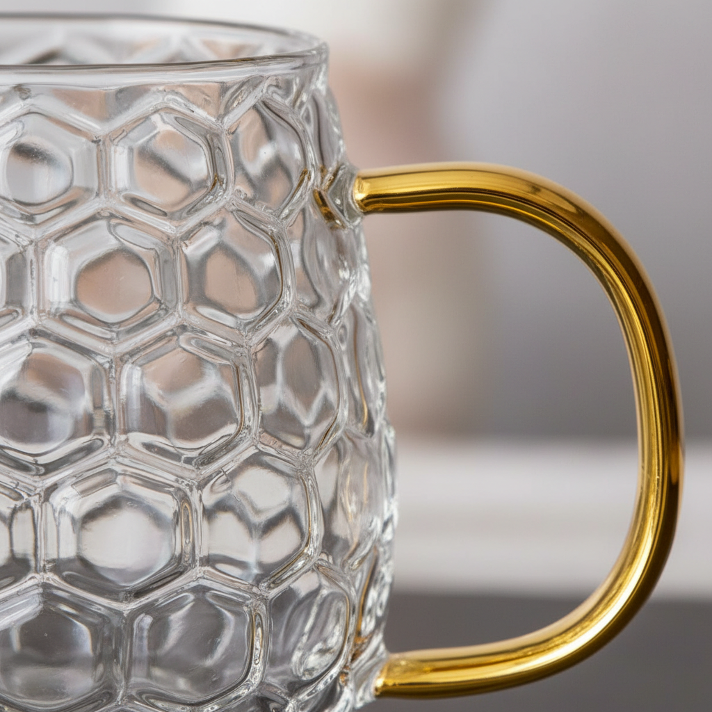 Add a touch of sunshine to your sip with the Honeycomb Glass Mug, featuring a unique honeycomb texture and a gleaming gold handle for an elegant finish. Made from heat-resistant borosilicate glass, this mug is lightweight yet durable, perfect for your favorite hot or iced beverages.