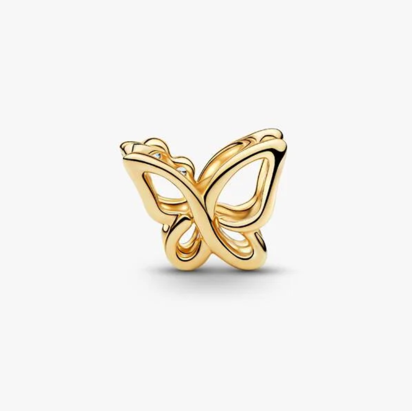 Celebrate transformation and beauty with the Butterfly Openwork Pandora Charm. This elegant charm features an openwork butterfly design crafted in 14k gold plating and accented with sparkling cubic zirconia stones. Hand-finished by Pandora artisans, it serves as a delicate reminder that, like nature, we are always evolving and growing.