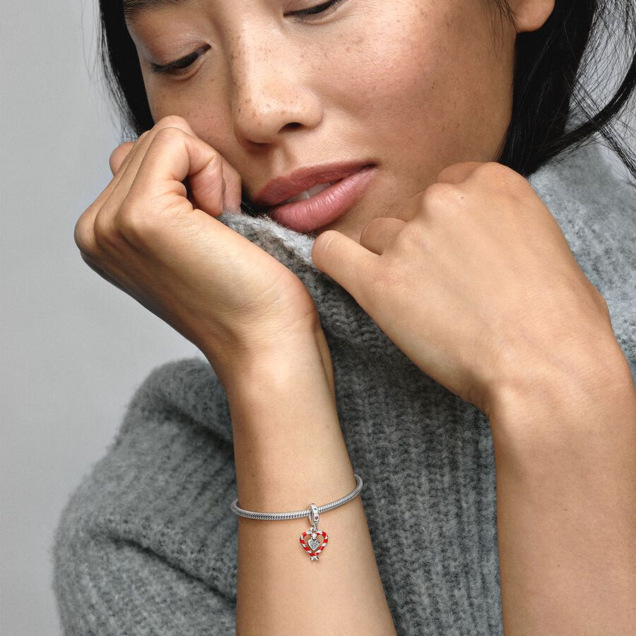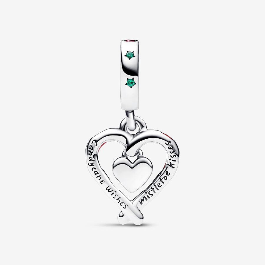 Celebrate the sweetness of the season with the Double Candy Cane Heart Dangle Charm from Pandora. Crafted in sterling silver and accented with vibrant red enamel, this festive charm features two candy canes forming a heart shape with a dangling center heart engraved with “Sweet heart.” The reverse sides read “Candy cane wishes” and “Mistletoe kisses,” adding a joyful holiday touch to your bracelet. Sparkling cubic zirconia and man-made crystals complete this playful Christmas design.