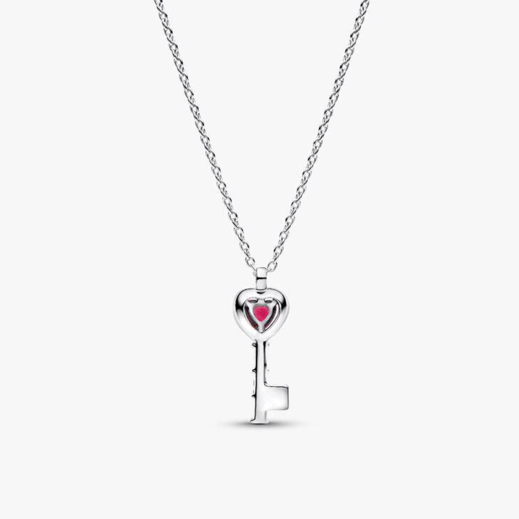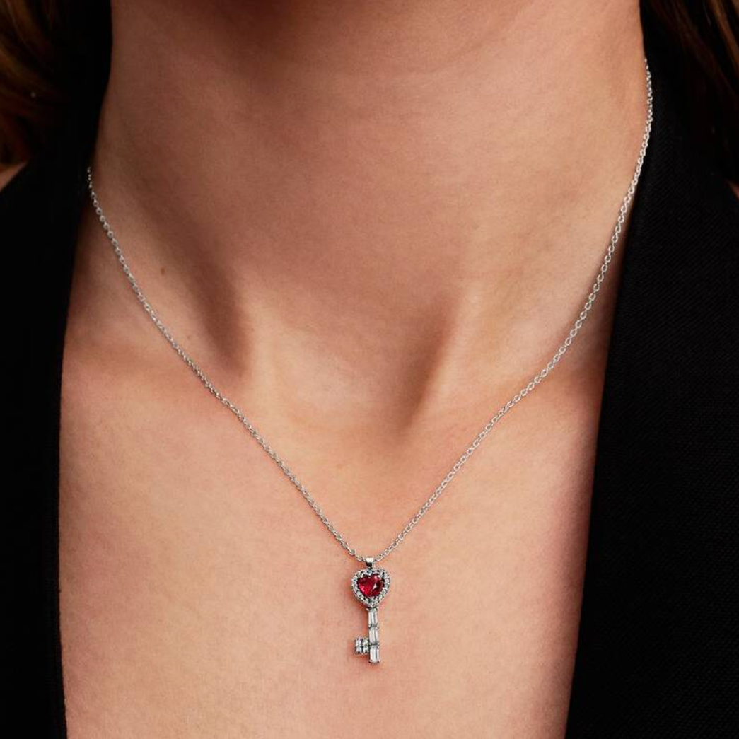 Unlock a world of sparkle with this stunning sterling silver heart key pendant. Featuring a vibrant red crystal centerpiece surrounded by clear cubic zirconia accents, this elegant necklace adds a touch of romance and sophistication to any outfit. Designed with adjustable lengths, it can be worn at three different sizes to perfectly complement your style. Hand-finished by Pandora artisans for exceptional quality and shine.