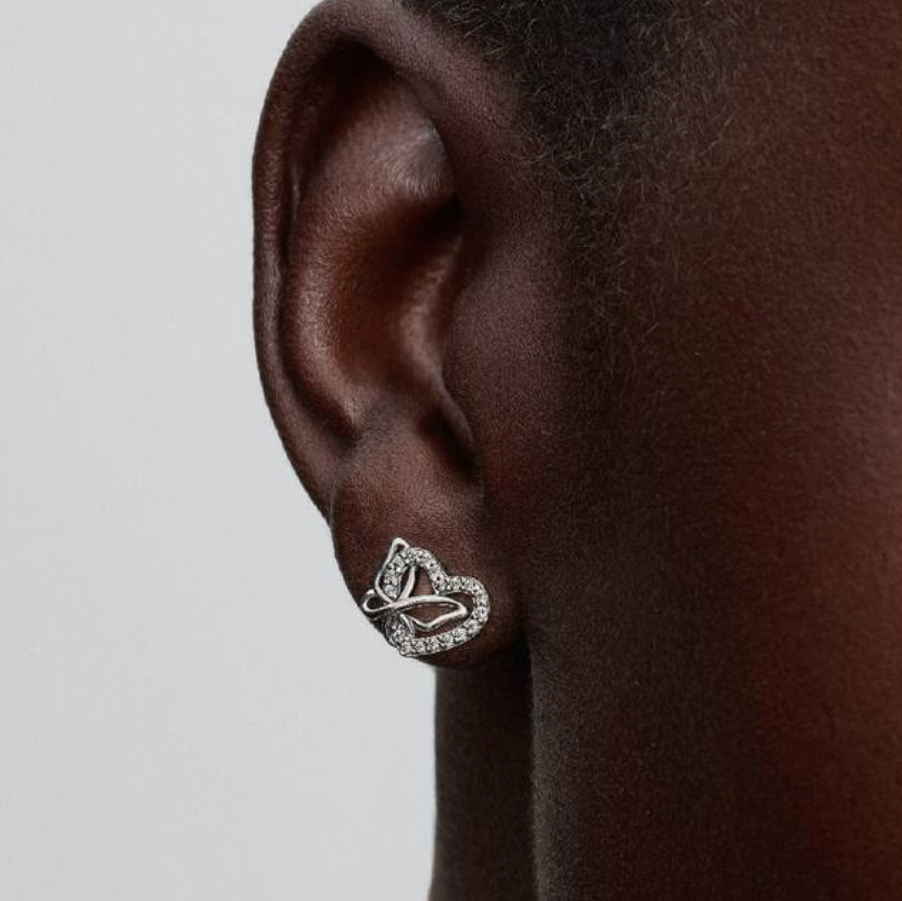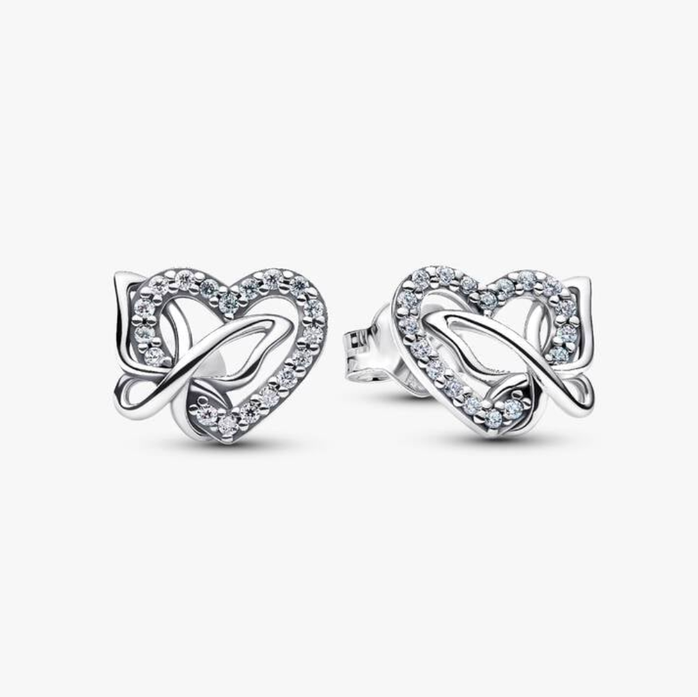 Celebrate love and transformation with the Entwined Butterfly and Heart Earrings by Pandora. These sterling silver stud earrings feature an openwork heart entwined with a delicate butterfly, adorned with 36 sparkling cubic zirconia stones for a touch of shimmer. Handcrafted by Pandora artisans, they combine elegance, symbolism, and sparkle in a timeless design.