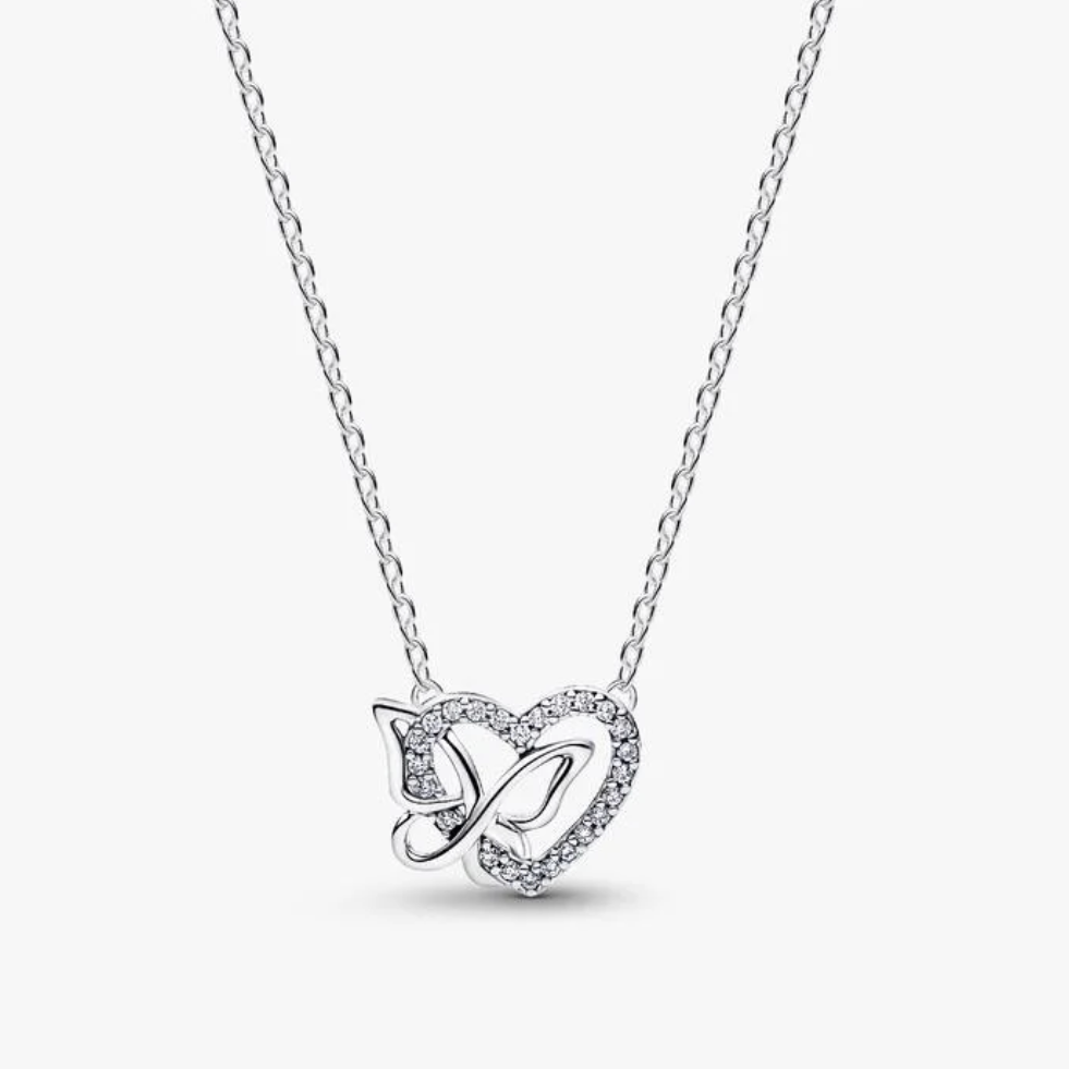 Celebrate love and nature with the Entwined Butterfly Heart Necklace by Pandora. This elegant sterling silver necklace features an openwork heart delicately entwined with a butterfly, adorned with sparkling cubic zirconia stones for a touch of shimmer. Handcrafted by skilled Pandora artisans, it serves as a beautiful reminder of the connection between love and the natural world.