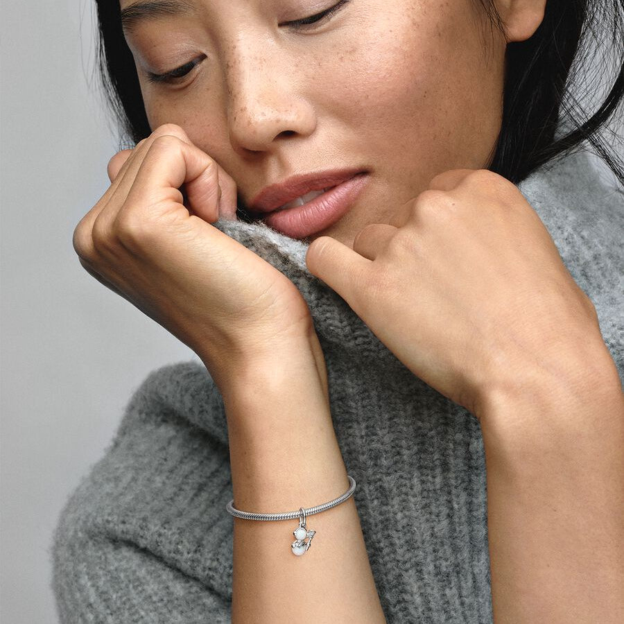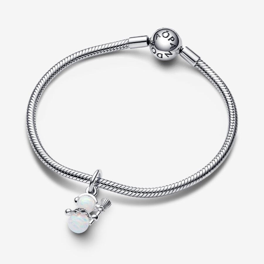Celebrate the magic of winter with the Opalescent Dangle Snowman Charm from Pandora. This delightful design captures the joy of snowy days with two luminous lab-created opals forming the snowman’s body. The sterling silver charm sparkles with pavé details on the scarf, a grooved broom, and tiny microbeaded ear-warmers for a touch of playful elegance. Perfect for adding festive charm and a winter glow to your Pandora collection.