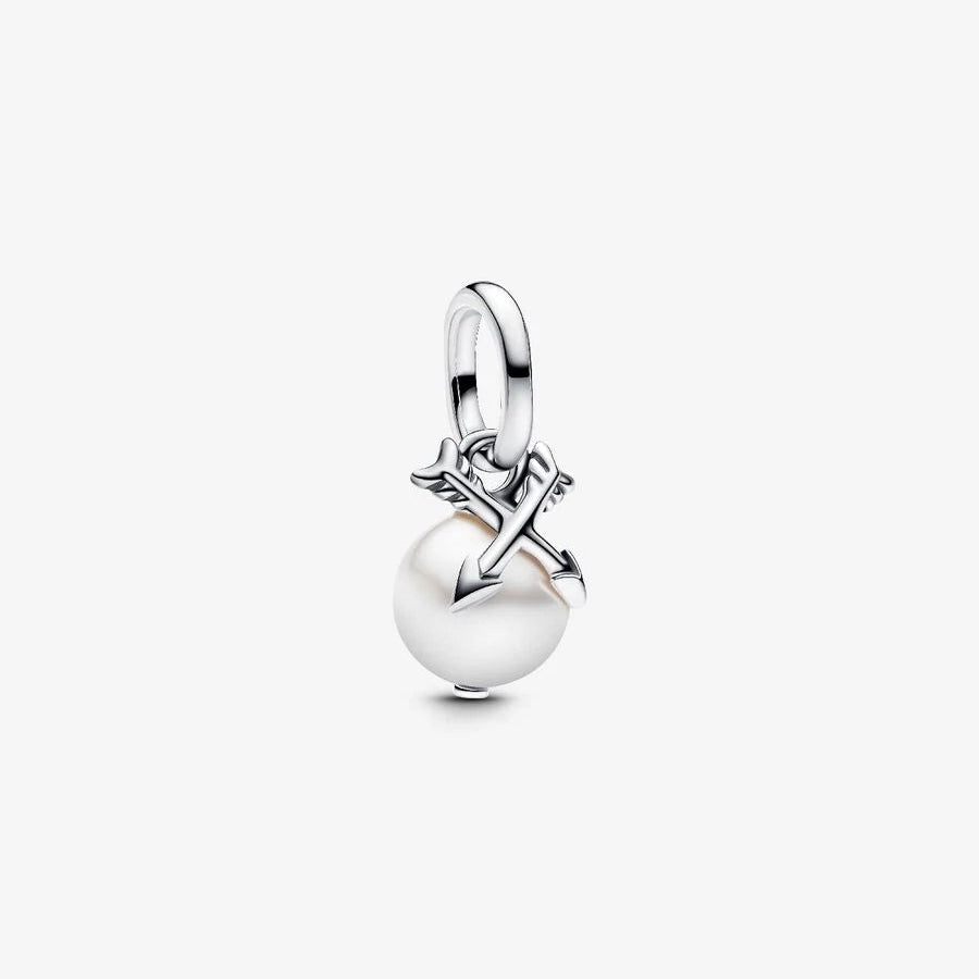 Combine elegance and symbolism with this Sterling Silver Pearl & Arrows Mini Dangle Pandora charm. Featuring a lacquered artificial pearl paired with two intricately detailed arrows, it represents love, direction, and the meaningful connections in your life.