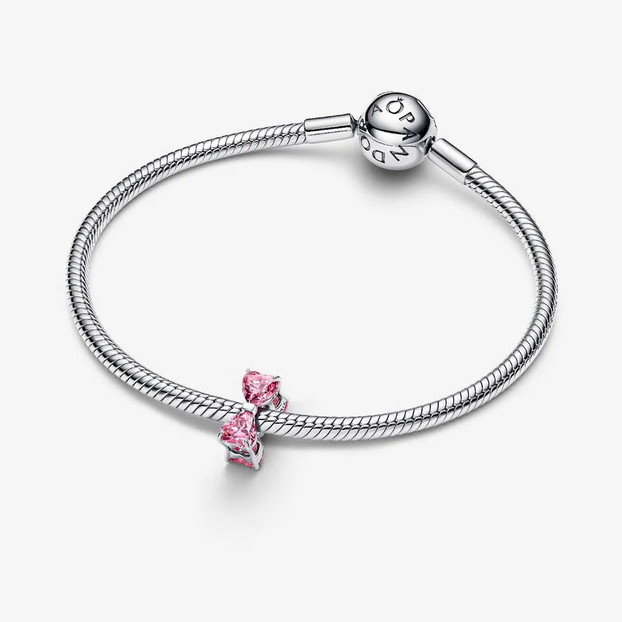 Put a bow on your style with this sterling silver Pink Bow Pandora charm. Featuring sparkling pink heart-shaped cubic zirconia, it celebrates life’s beautifully tied moments and adds a delicate, festive touch to any bracelet.