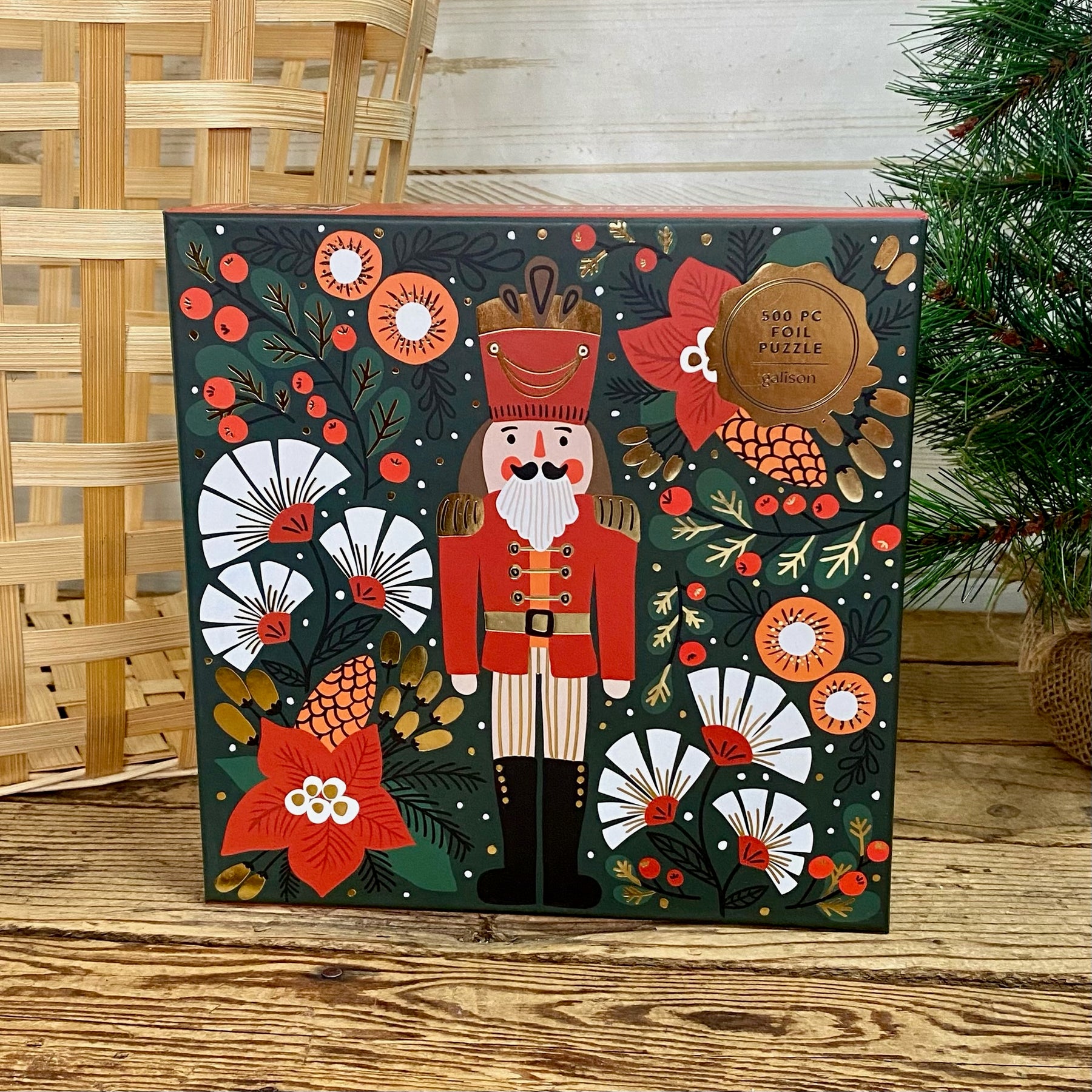 Celebrate the holidays in style with the Merry Nutcracker Puzzle, a 500-piece jigsaw featuring Sandra Hutter’s festive artwork enhanced with metallic foil accents. Each precision-cut piece comes together to reveal a joyful nutcracker scene, where shimmering foil details reflect light and bring the design to life. Perfect for holiday gatherings, cozy winter nights, or gifting, this elegant puzzle offers both challenge and charm.