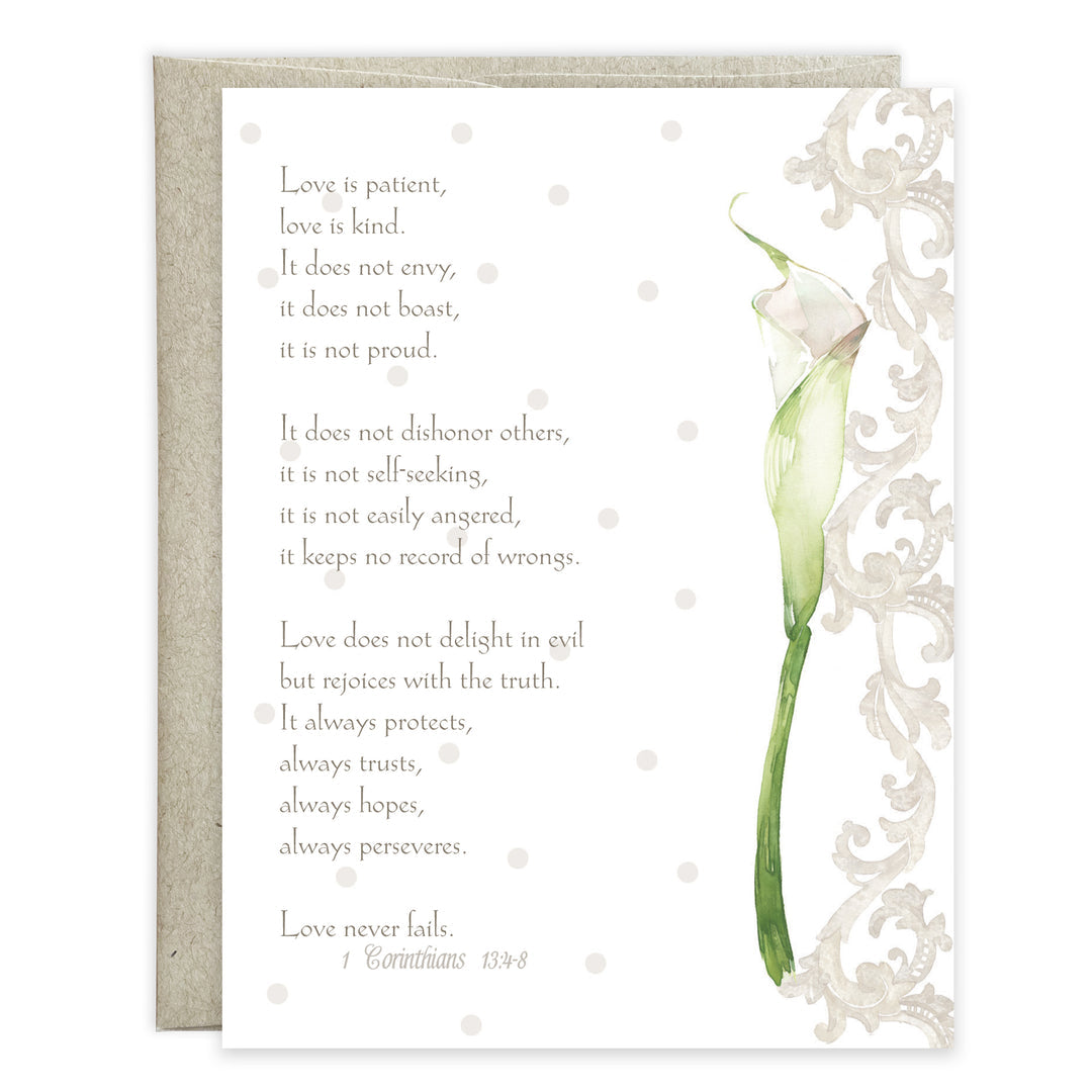 Celebrate a sacred union with the Congratulation Scripture Wedding Card, featuring the beloved Bible passage from 1 Corinthians 13:4–8 on the front. This timeless scripture beautifully reflects the heart of marriage, making it a meaningful way to honor love, faith, and commitment on a couple’s wedding day.