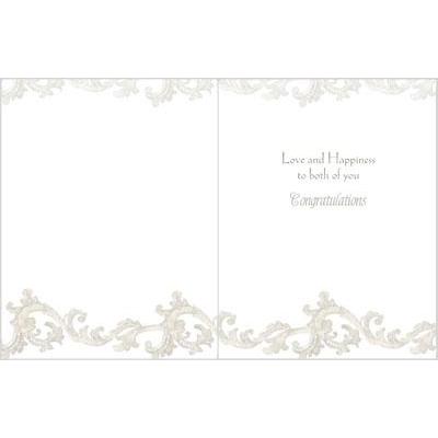 The inside message reads: “Love and happiness to both of you. Congratulations.”—a warm and joyful sentiment for celebrating newlyweds.