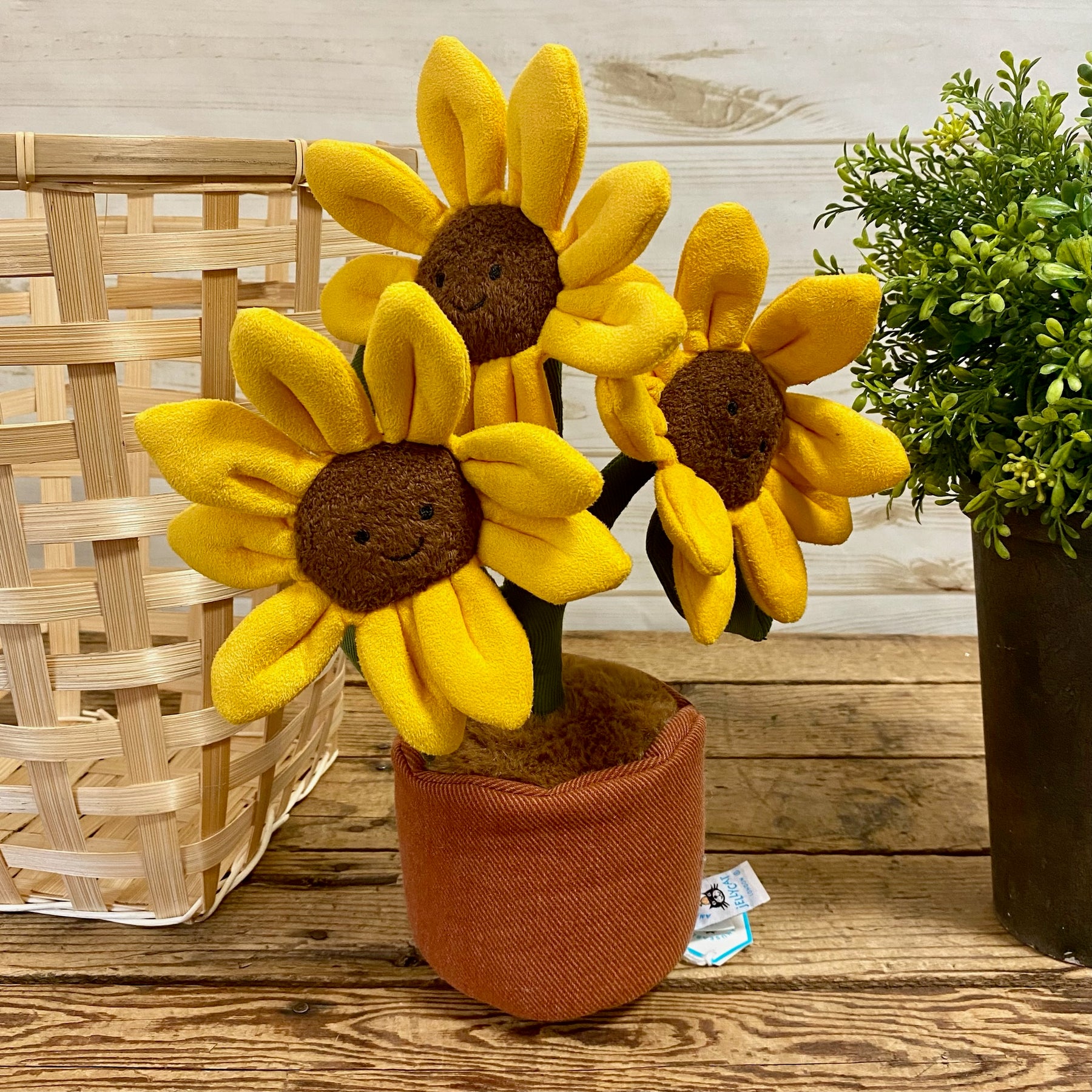 Add a little sunshine to your day with Jellycat's Amuseables Sunflower. This trio of flowers have brown fur faces, bright yellow petals and deep green stalks. Sat in a beautiful brown linen pot with mocha soil, these bright flowers make every day a little sunnier.