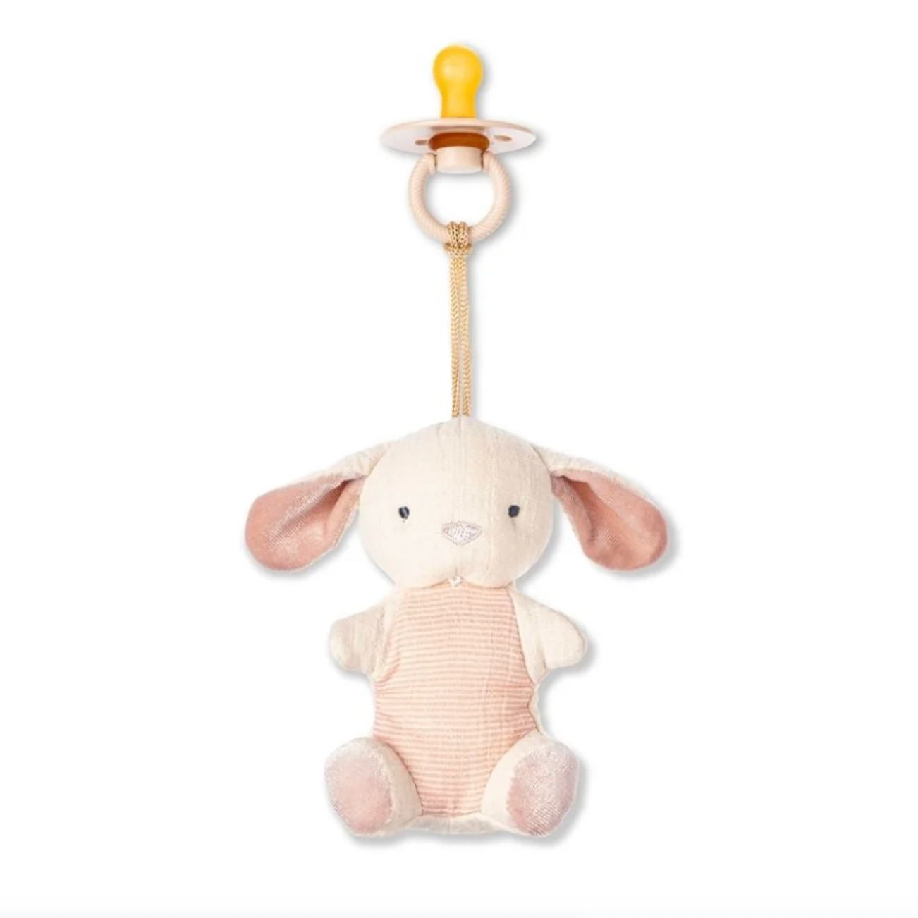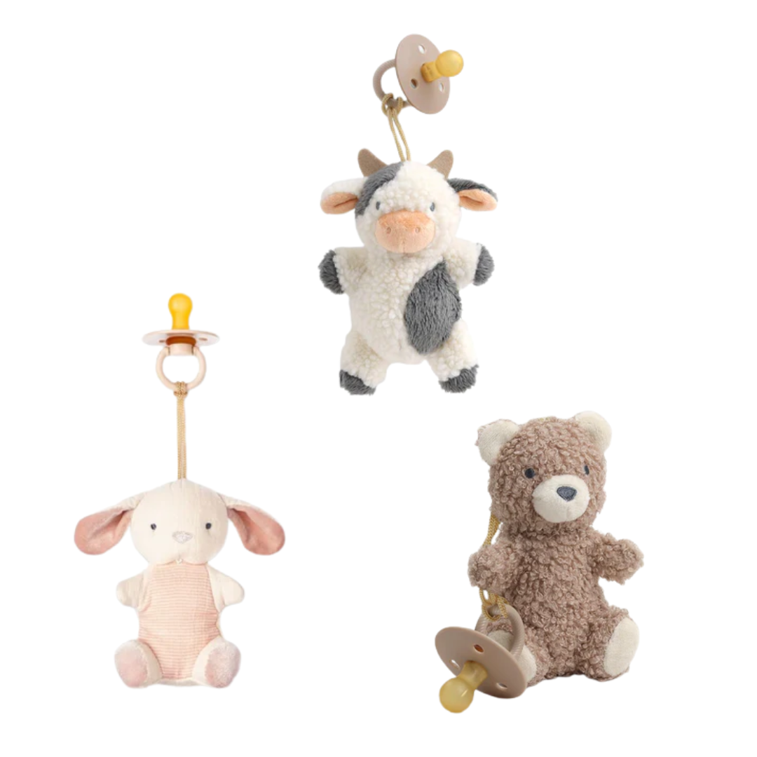 Meet The Bitzy Pal™, the perfect cuddly companion and soothing pacifier all in one! Part of Itzy Ritzy’s Bitzy Bespoke™ toy collection, this plush lovey attaches securely to the included Itzy Soother™ pacifier featuring a natural rubber nipple. Soft cotton fabric and an easy-to-grasp design make it an instant favorite for babies, keeping pacifiers close while providing comfort and snuggles.