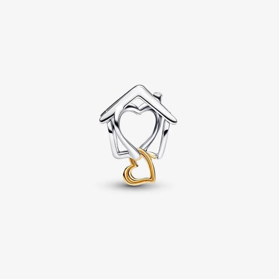Celebrate love and belonging with this sterling silver and 14k gold-plated Home & Heart Pandora charm. Featuring an openwork house with a dangling heart engraved “With you, I’m home,” it’s a heartfelt addition to any bracelet.