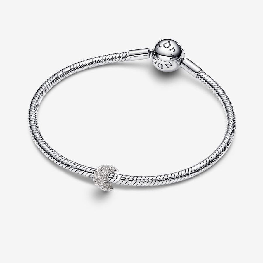 Shine bright with the Mini Textured Crescent Moon Charm by Pandora. Crafted in sterling silver with a diamond-point texture, this delicate charm serves as a luminous reminder to follow your own light. Perfect for layering with other charms or wearing solo, it adds subtle celestial elegance to any bracelet.